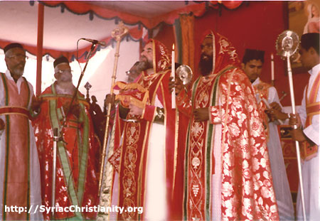 His Beatitude the Catholicos of the East Aboon Mor Baselios Paulose II of blessed memory, accompanied His Holiness throughout the Apostolic visit. The consecration of the Holy Mooron (Chrism) at the famous Manarcaud St.Mary's Church was one of the high points of the Patriarch's first Apostolic visit. His Beatitude the Catholicos and a host of prelates and priests assisted the Patriarch on the Holy ceremony. This was only the third time in the history of the Malankara Church, Holy Mooron was consecrated here in India. Earlier Patriarch Ignatius Peter IV (III) and Patriarch Ignatius Abdulla II had consecrated the Holy Mooron in 1876 and 1910 respectively, both the consecration was at the famous Mulunthuruthy Marthoman Church. His Holiness also attended the 50th Dhukrono Jubilee of the late lamented Patriarch Ignatius Elias III at Majanikkara Dayro and offered, the Requiem Mass on Feb 13th. On March 6th His Holiness consecrated an assistant Metropolitan, Abraham Mor Severious, for the diocese of Angamali. The ordination ceremony was at the Kothamangalam Marthoman church (Cheria Pally). After successfully completing the first Apostolic visit, His Holiness the Patriarch left this country on March 24th. His Holiness during this visit visited more than a hundred parishes - a tenth of the Jacobite Syrian Orthodox parishes, including those at Mumbai, Banglore, Manglore, Chennai and New Delhi.