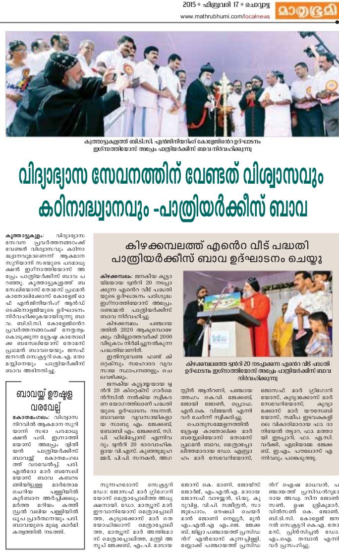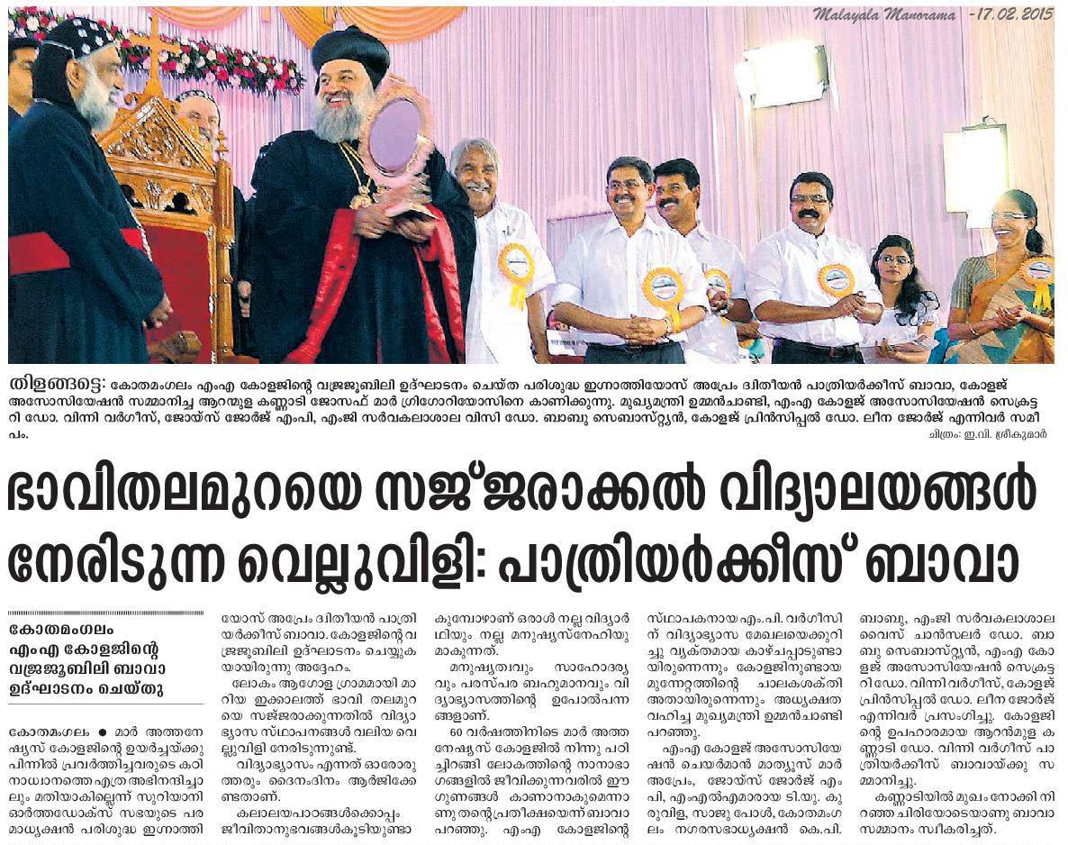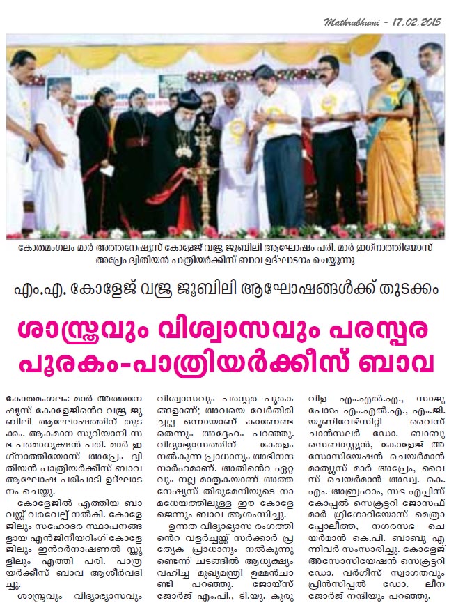 February 17, 2015:  Patriarch of the Syrian Orthodox Church Ignatius Aphrem II inaugurated the diamond jubilee celebrations of Mar Athanasius College at Kothamangalam on Monday.