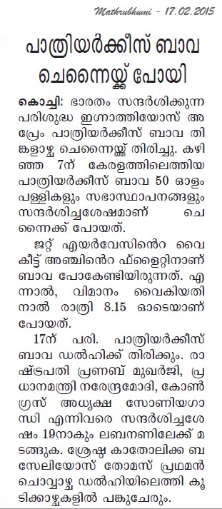 February 17, 2015:   Patriarch of the Syrian Orthodox Church Ignatius Aphrem II left for Chennai on Monday after a 10-day visit to the State. The Patriarch, who is scheduled to dedicate a church in Chennai on Tuesday morning, was seen off at the Cochin international airport by Saju Paul and V.P. Sajeendran, MLAs. The Patriarch, accompanied by members of the clergy and a large group of Jacobite Church members, left the airport around 8.15 p.m.