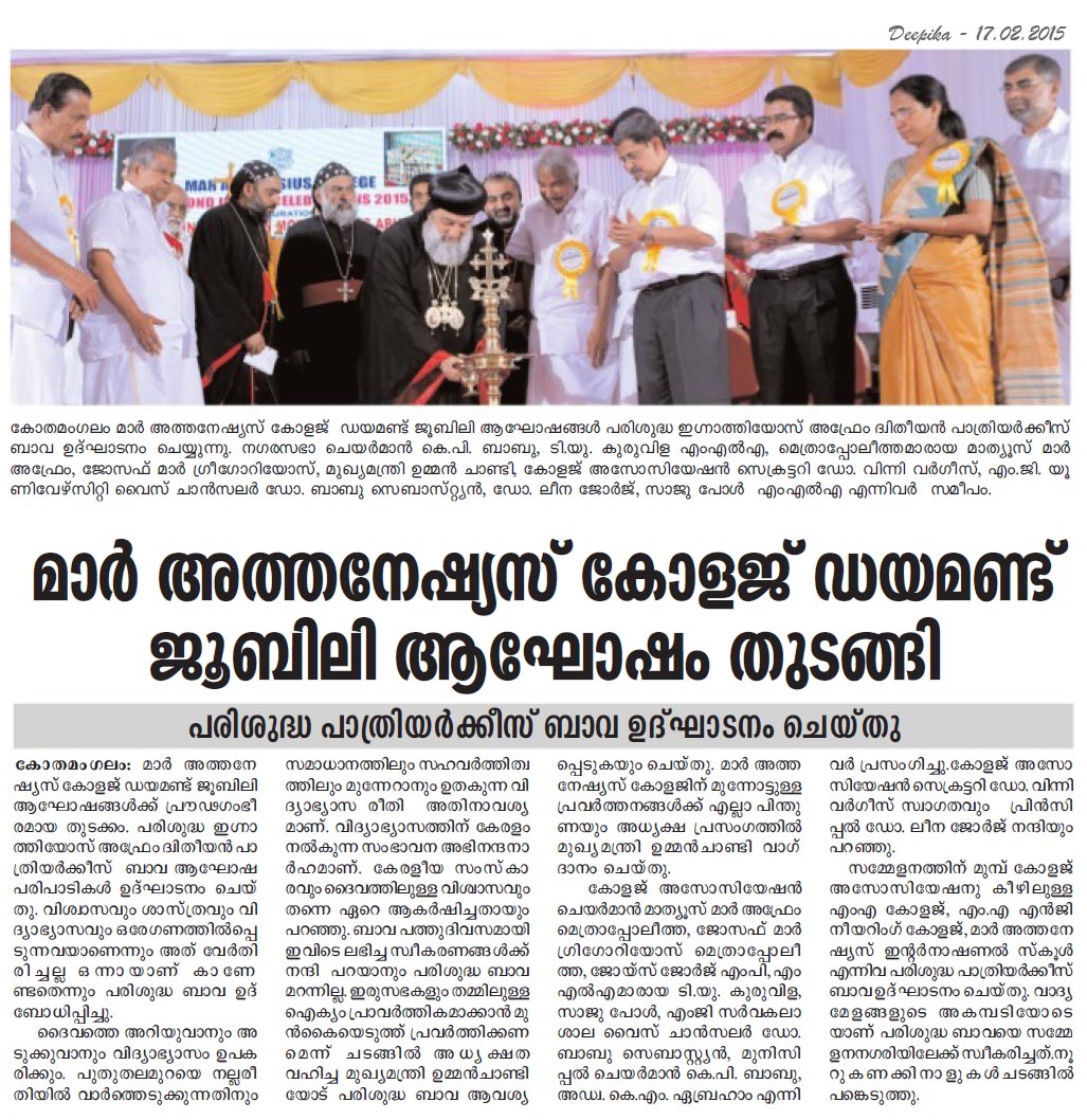 Chief Minister Oommen Chandy presided. Joyce George, MP, delivered the keynote address. Metropolitans Joseph Mar Gregorios, Mathews Mar Aprem; MLAs T.U. Kuruvila, Saju Paul; K.P. Babu, Chairman, Kothamangalam municipality; Prof. Babu Sebastian, Vice Chancellor of Mahatma Gandhi university; Prof. Winny Varghese, Secretary of the Mar Athanasius College Association; and Dr. Leena George, Principal attended.