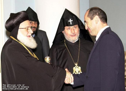 The President Robert Kocharian received the Supreme Head of the Universal Syrian Orthodox Church, His Holiness Moran Mor Ignatius Zakka I, who was on a visit to Armenia in October 2002. The holy father was accompanied by the Armenian Catholicos, His Holiness Garegin II and other high-ranking clergy. Having welcomed the Patriarch’s visit to Armenia, Robert Kocharian said that the Armenia Church has had an extremely important contribution and role in the life of the Armenian nation. According to him, the Armenian Church has always supported the Armenian state.